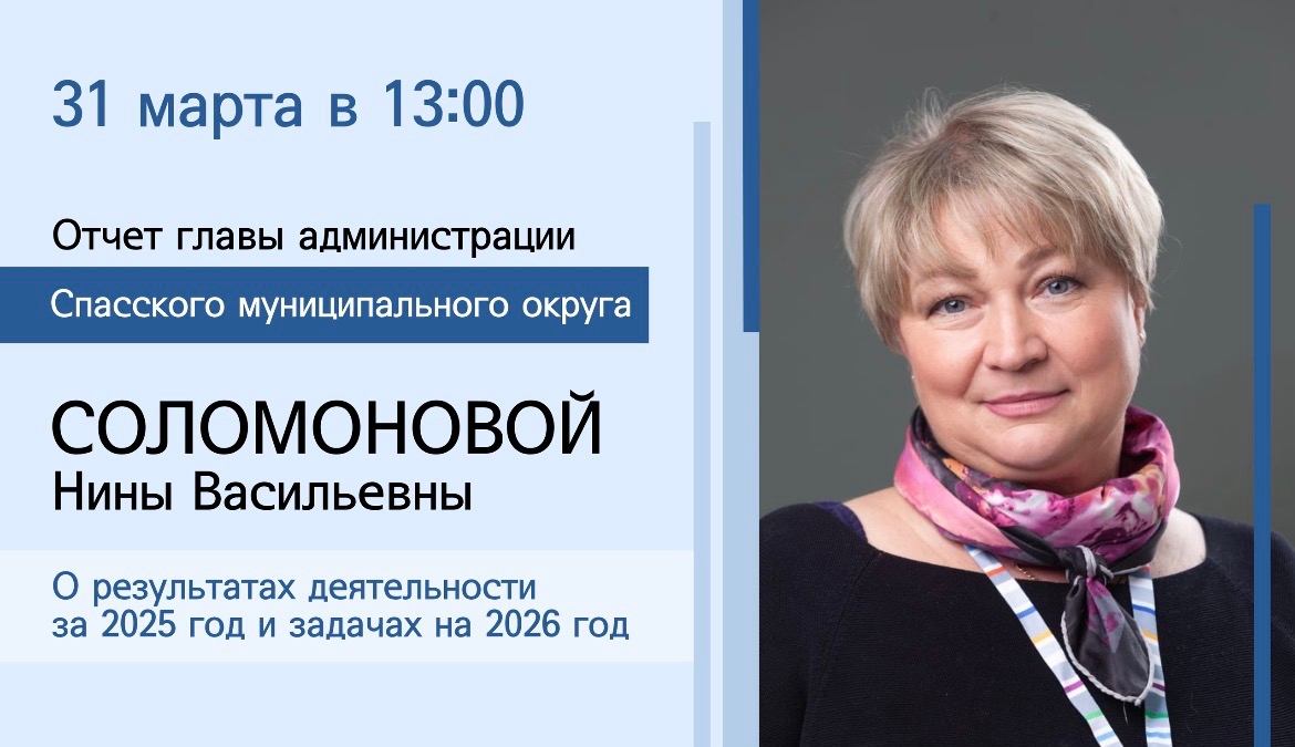 31 марта 2026 года глава Спасского муниципального округа Нина Соломонова выступит с отчётным докладом о результатах деятельности администрации за 2025 год, а также расскажет о планах на 2026 год.