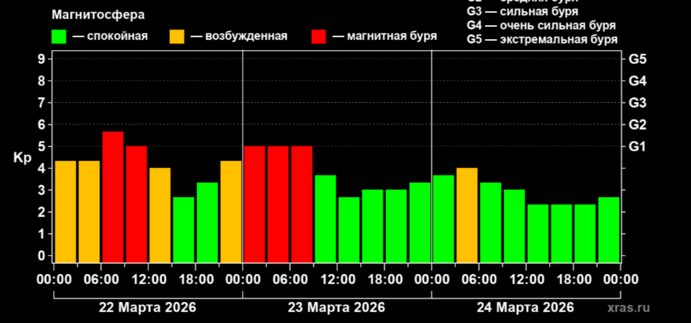 Сегодня и завтра, 22 и 23 марта прогнозируется буря класса G1-G2. Геомагнитная обстановка Земли придёт в норму только к полудню 24 марта. Метеозависимые люди могут чувствовать недомогание и головную боль.