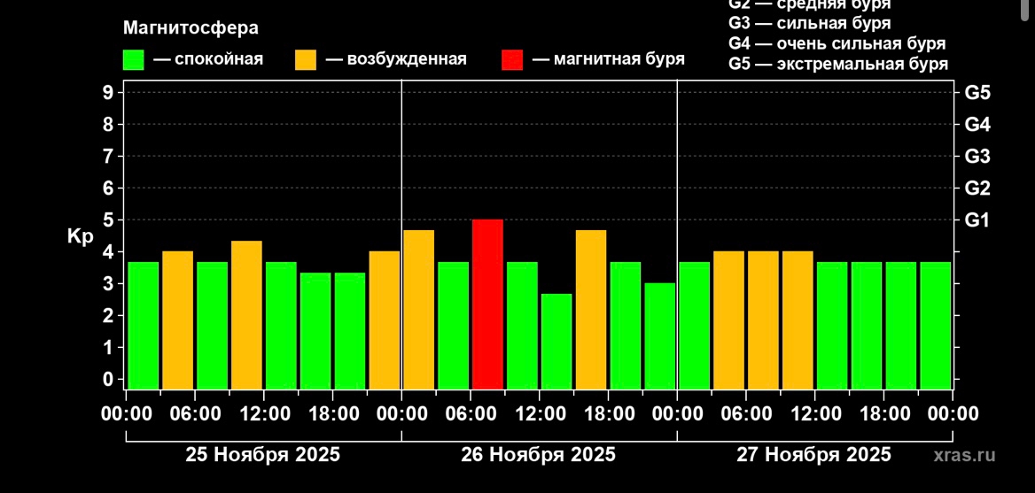 Сегодня, 25 ноября и в течение ближайших нескольких дней, вплоть до 28 ноября рязанцев ждёт череда магнитных бурь, сообщает Лаборатория солнечной астрономии. Прогнозируются магнитные бури класса G1. При том геомагнитное поле Земли будет то возмущённым, то приходить в норму.